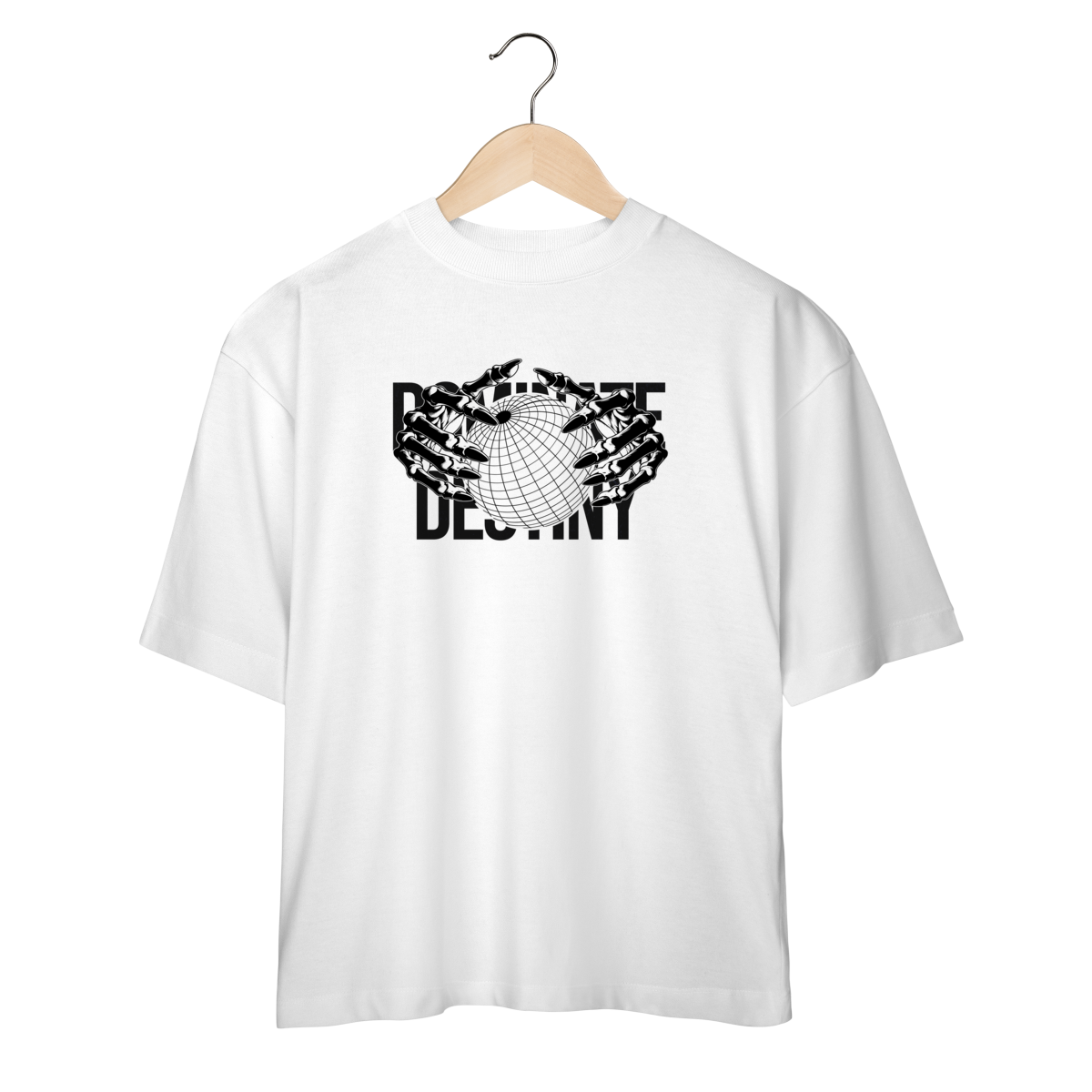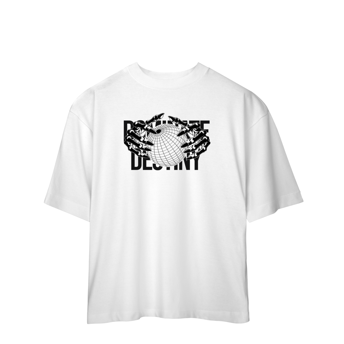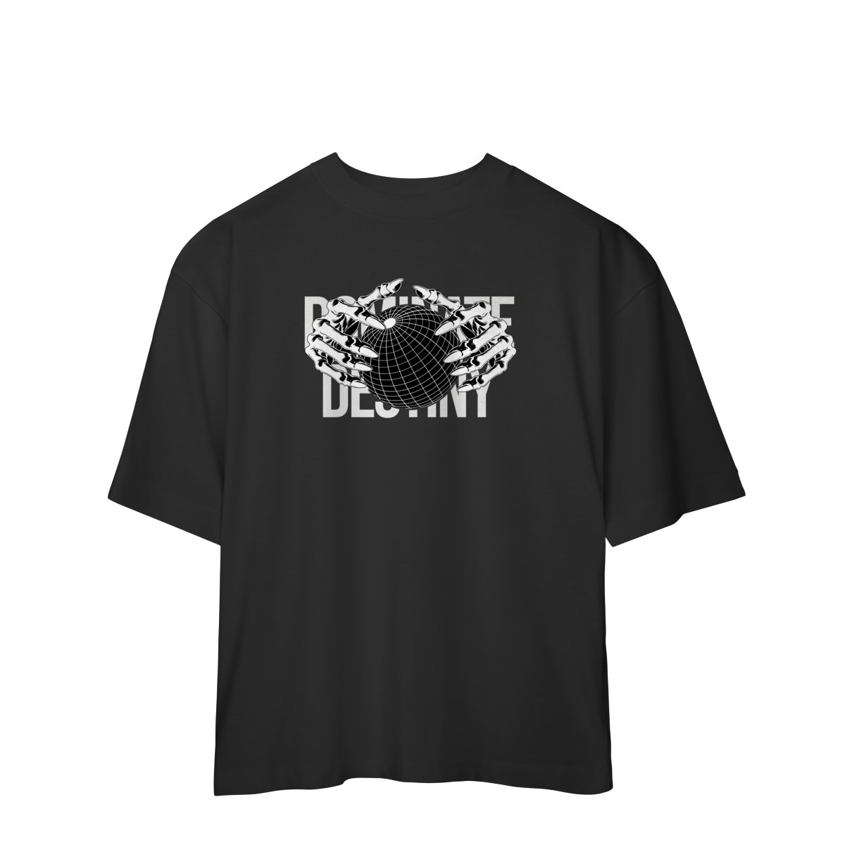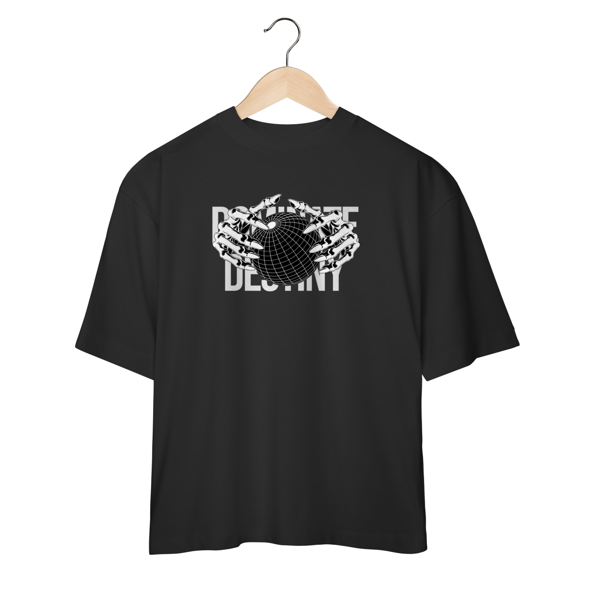 Com design minimalista em preto e branco, a estampa apresenta mãos metálicas envolvendo o globo, sobrepondo o texto “DEFINE DESTINY”.