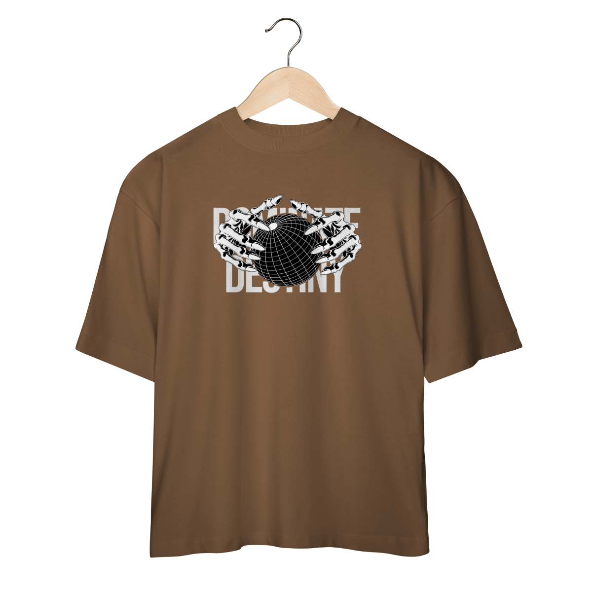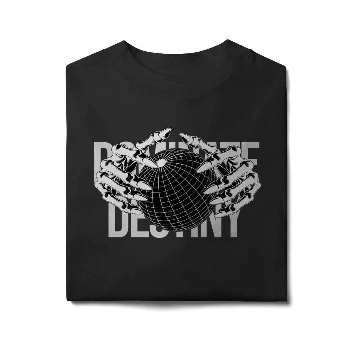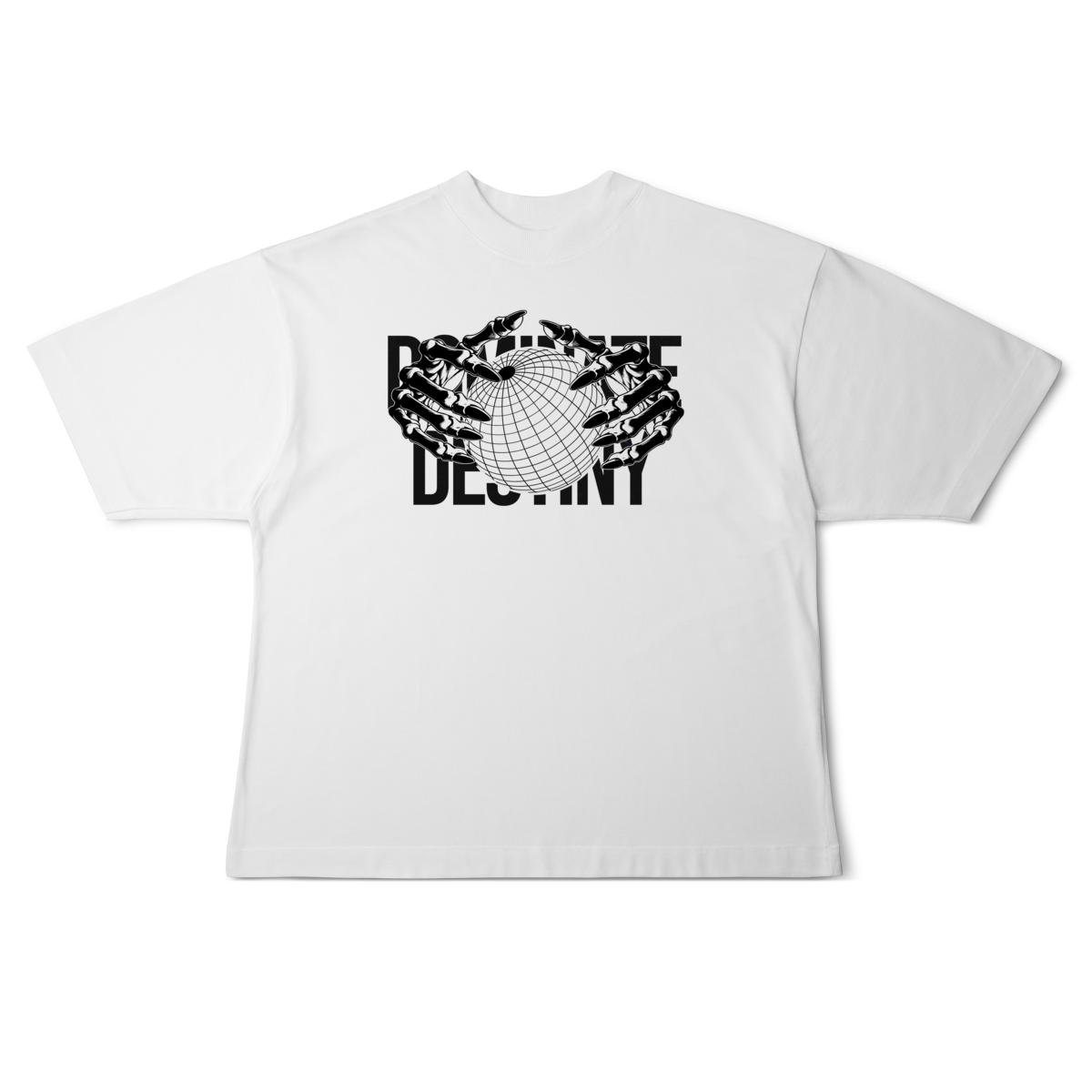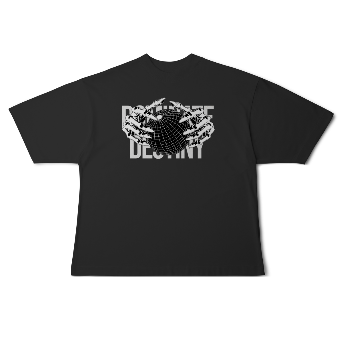 Com design minimalista em preto e branco, a estampa apresenta mãos metálicas envolvendo o globo, sobrepondo o texto “DEFINE DESTINY”.