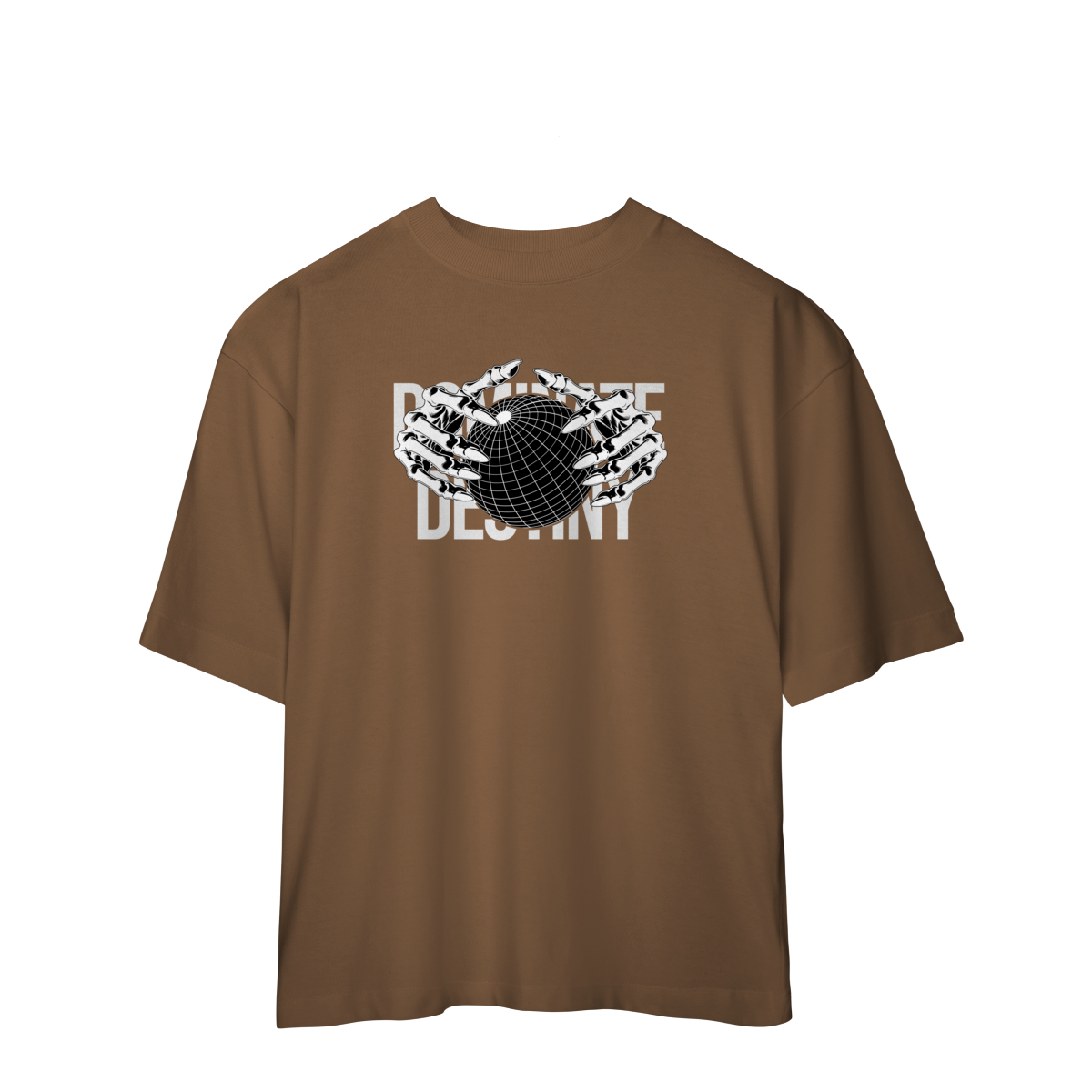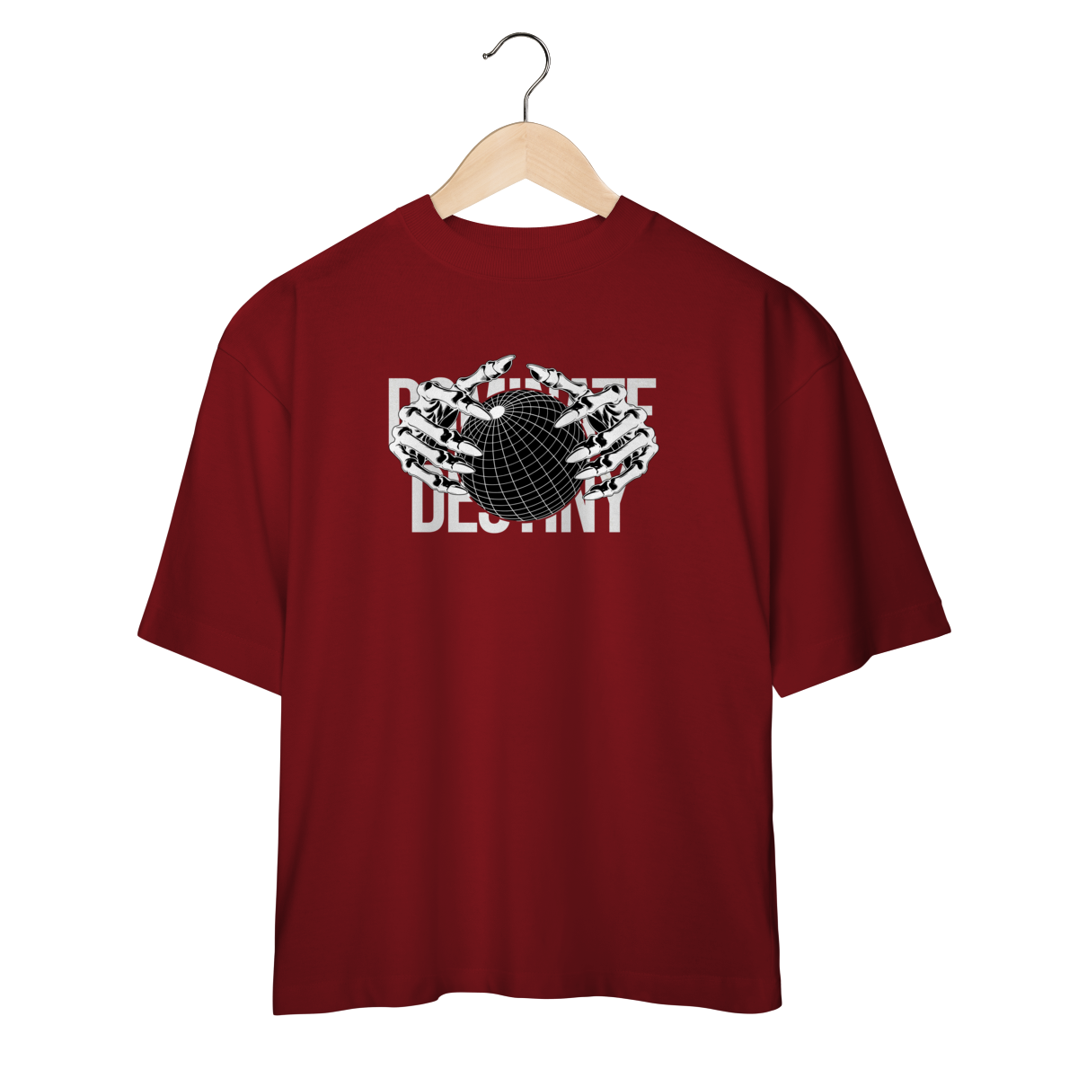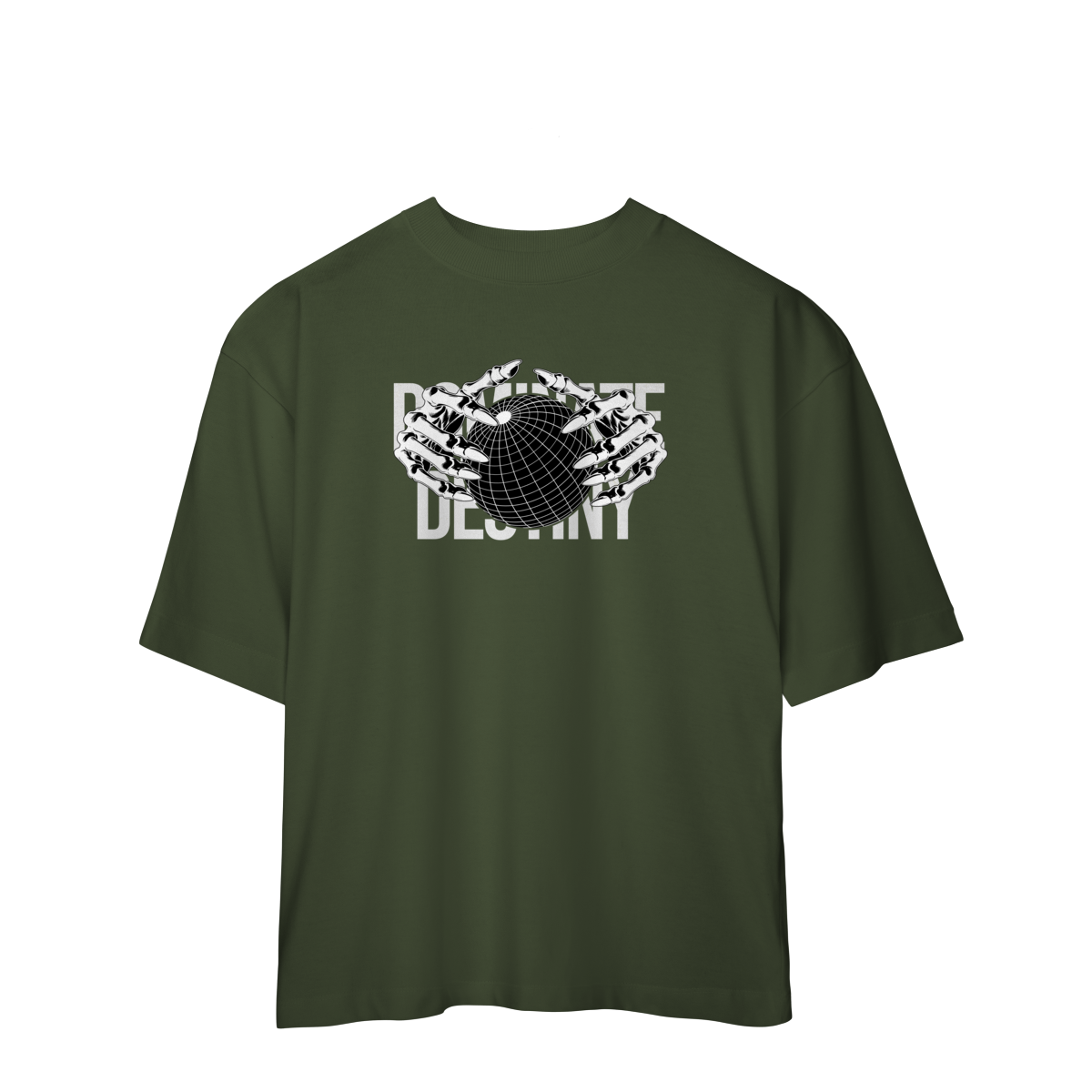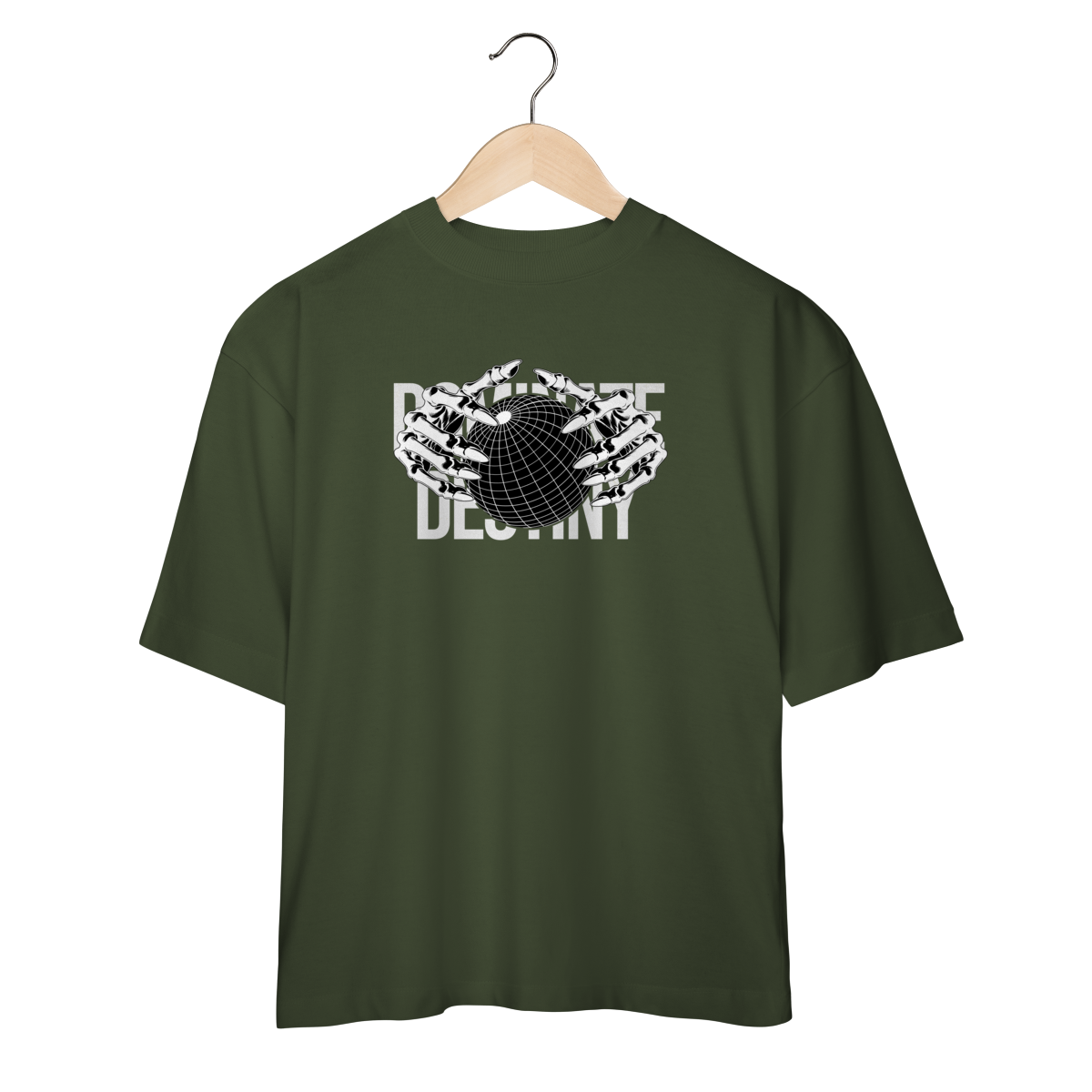 Com design minimalista em preto e branco, a estampa apresenta mãos metálicas envolvendo o globo, sobrepondo o texto “DEFINE DESTINY”.