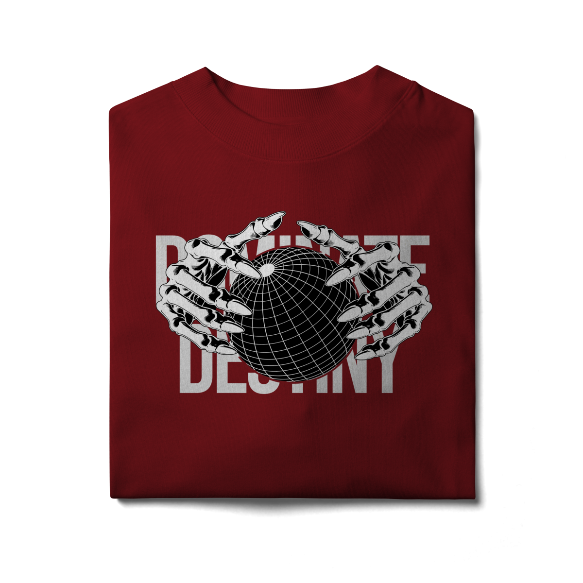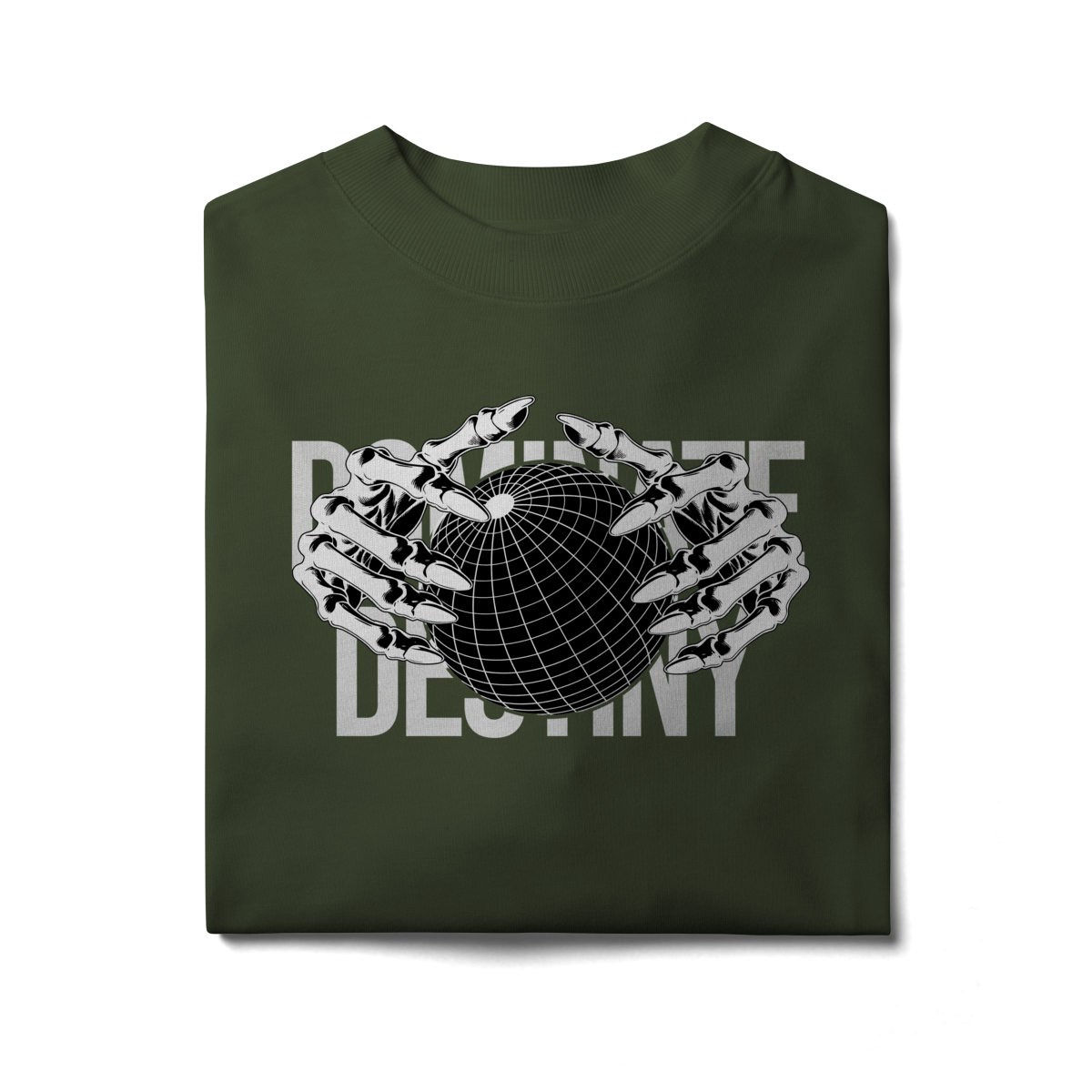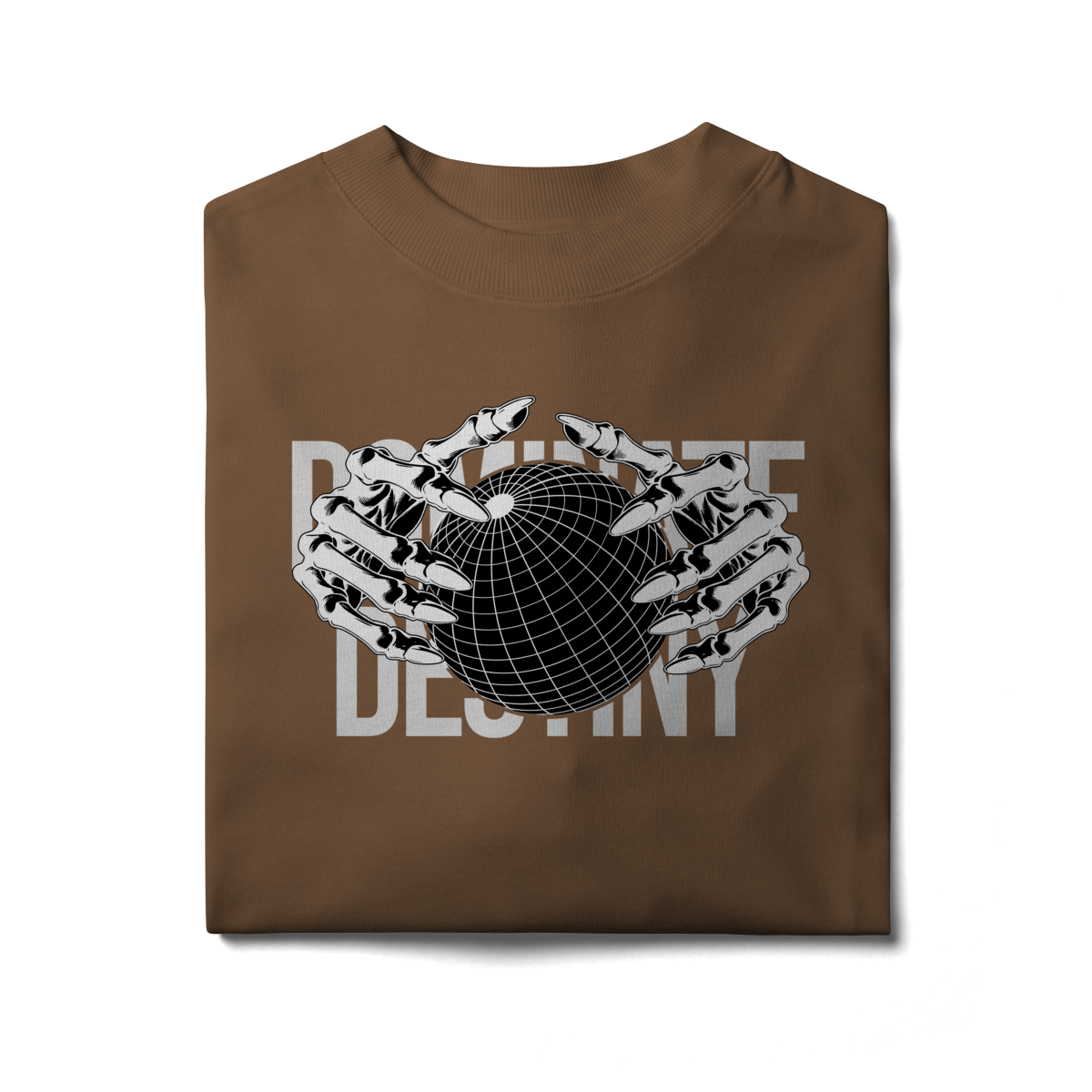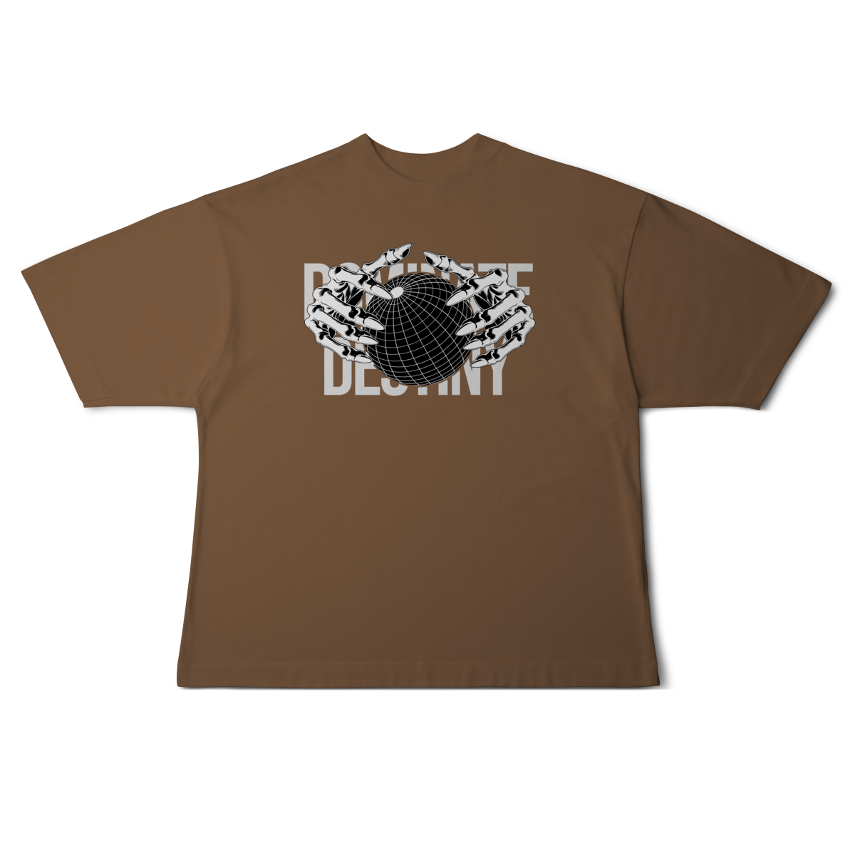 Com design minimalista em preto e branco, a estampa apresenta mãos metálicas envolvendo o globo, sobrepondo o texto “DEFINE DESTINY”.
