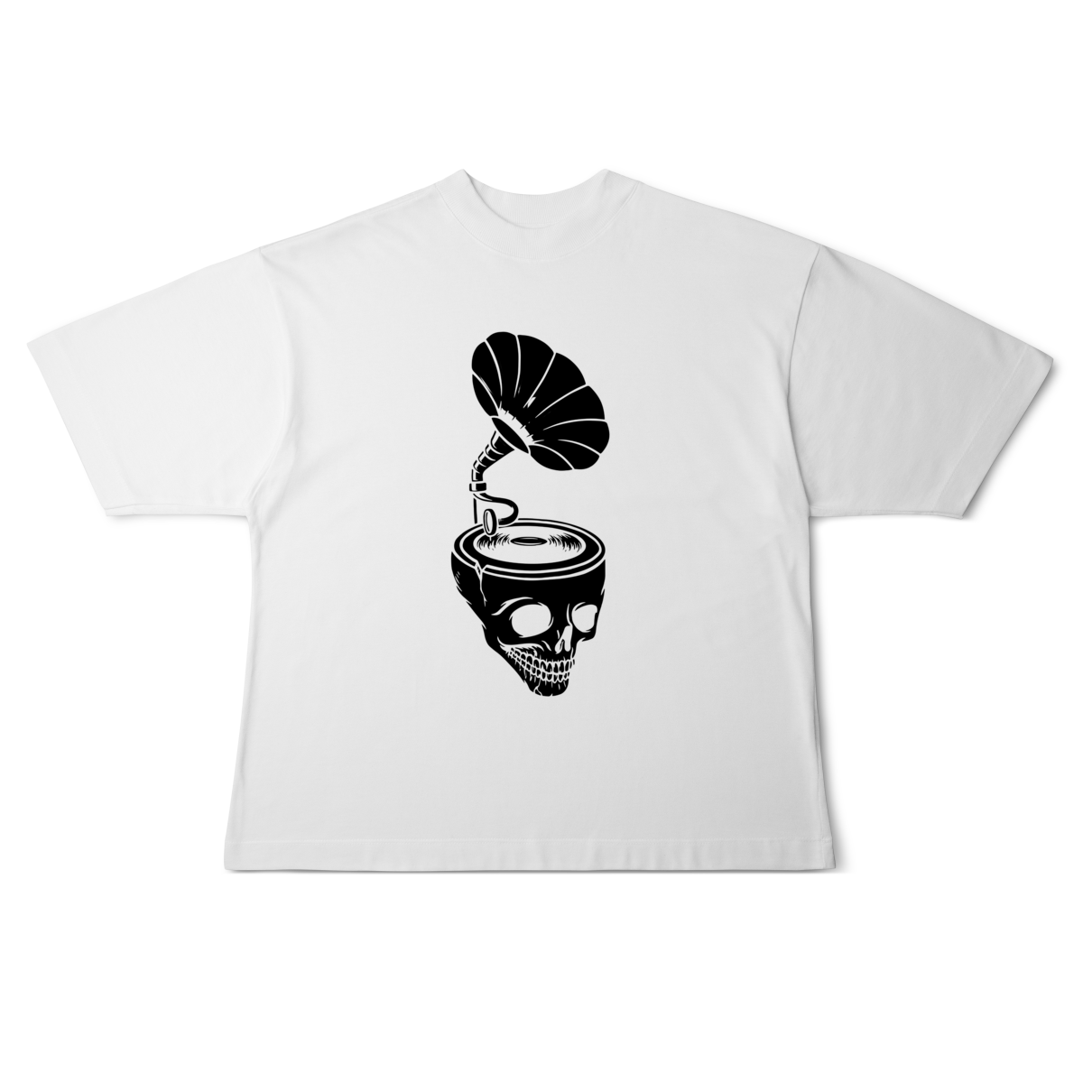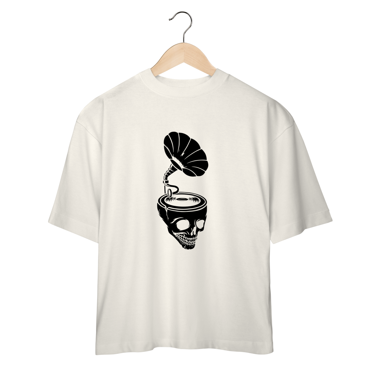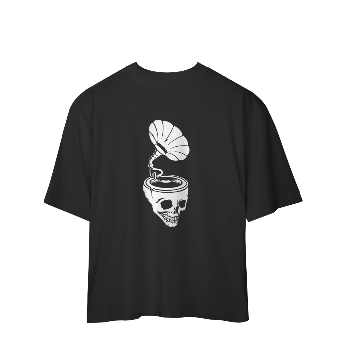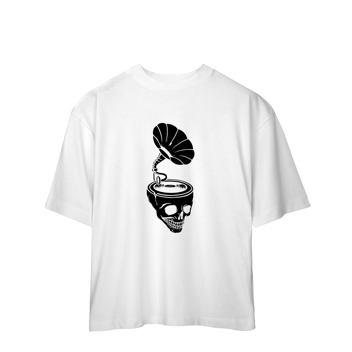 A Camiseta Overized Skull & Sound representa o contraste entre o analógico e o eterno: um gramofone emergindo de um crânio, tocando as frequências que nunca morrem.
